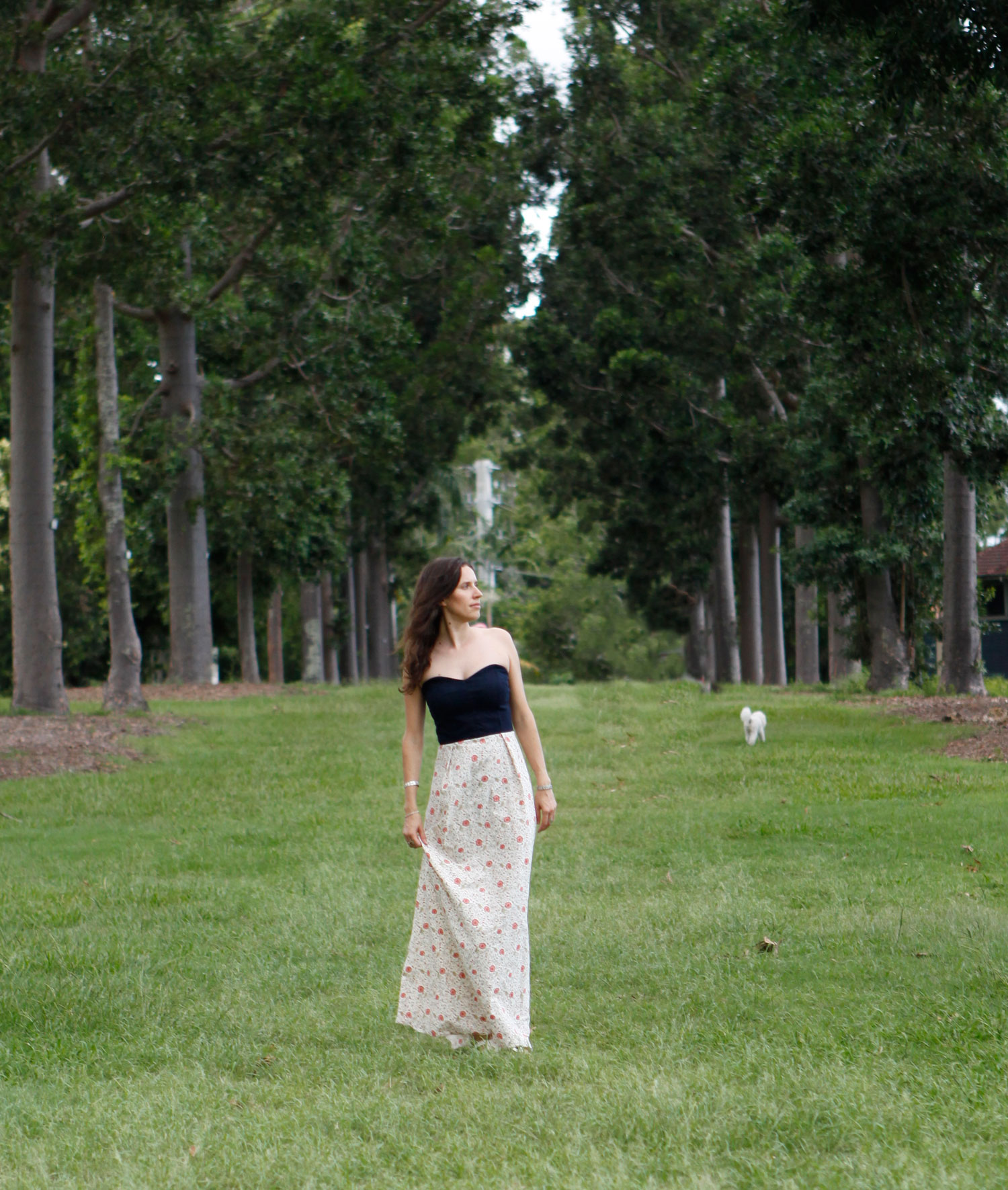 There was something I did a bit differently with this dress – I used 100% recycled materials. The bodice was made from an old pair of jeans that a girlfriend gave me, and the skirt came to me as a bed sheet in an op-shop!